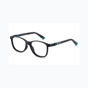 Quest 48.0 kids glasses in Matte Black/Turquoise. Sleek, minimal frames for everyday wear. Made from Siliflex with interchangeable temples, band and mini-band.